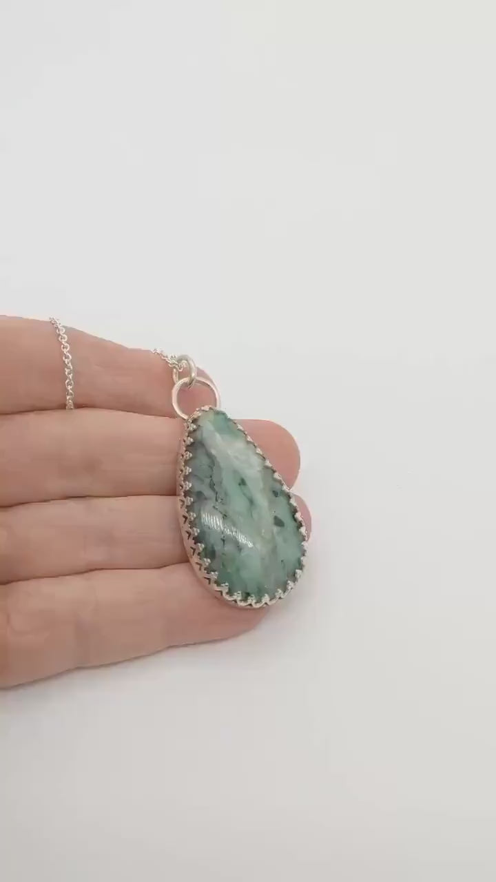 This African Turquoise jewelry set includes a hand-cut pendant and matching teardrop earrings, showcasing the stone’s natural matrix of teal, green, and creamy white. While reminiscent of traditional turquoise, African Turquoise carries its own beauty, with veining and patterns that ensure no two pieces are ever alike.