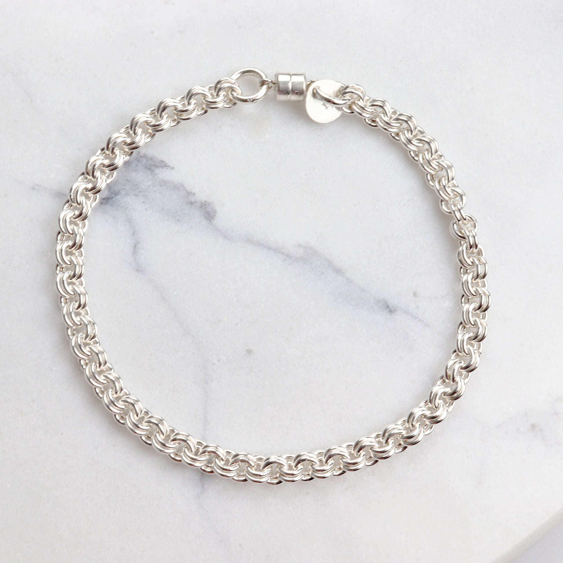 This handcrafted double cable chain bracelet is made with a true double-to-double ring weave, offering both strength and a smooth, flowing drape. Woven from Argentium® 940 Silver—brighter, hypoallergenic, and more tarnish-resistant than traditional sterling—this bracelet is a minimalist statement piece designed to last.