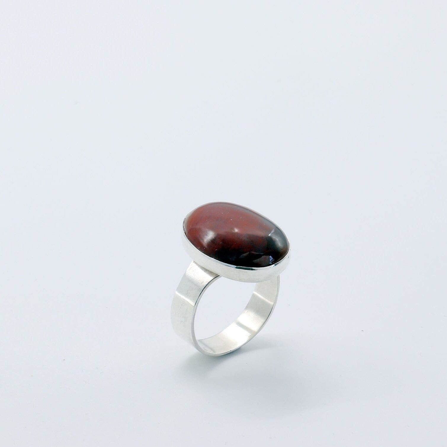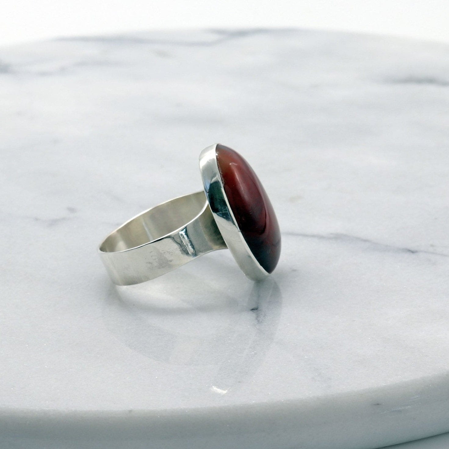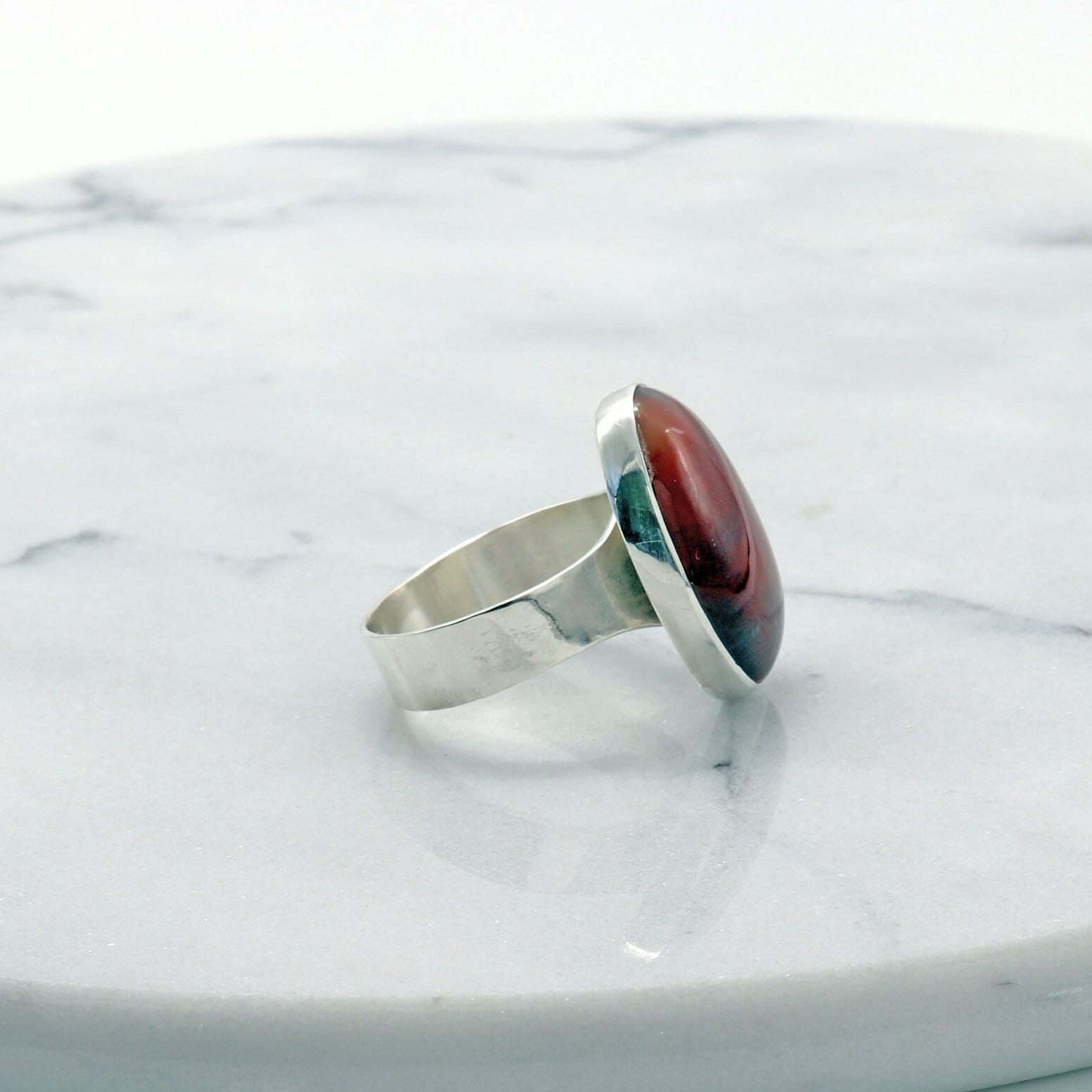 This bold men’s ring features a handcut cabochon of Petrified Rainbow Wood, showcasing natural reds, browns, and subtle blue undertones. The stone is set in a premium Argentium® 935 Silver band with a fine silver (.999) bezel, offering lasting shine, tarnish resistance, and hypoallergenic comfort.